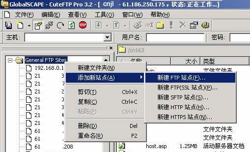 ★打開Cuteftp Pro,點擊左邊窗口"站點管理器",右擊"General FTP Sites"(如圖1),在出現(xiàn)的菜單中選擇"添加新站點"-->"新建FTP站點"。