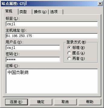 ★在出現(xiàn)的"站點屬性"窗口(如圖2)中,在"常規(guī)"選項卡中,輸入您的FTP相關資料,其中"登錄方式"中選擇"標準"。再點擊"確定"就行了。